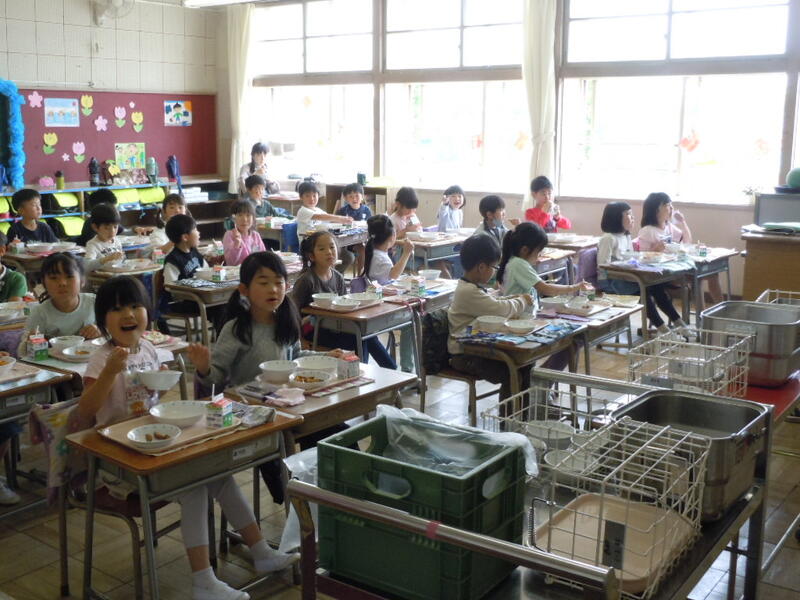 1年生の給食が始まりました。小学校生活初めての給食です。メニューは「チキンライス・フライドポテト・とろとろ豆スープ・牛乳」でした。どの子も美味しそうに食べていました。おかわりもできていました。