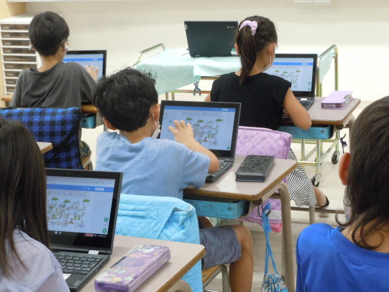 6年生社会「貴族のくらし」についてタブレットPCを活用しながら貴族が栄えたころの文化について学習しています。また、校庭では3年生体育「走り幅跳び」に取り組んでいました。