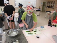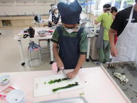 調理師さんが普段使っている調理道具を間近で見て、その大きさや重さに驚いていました。