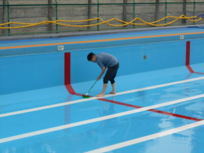 体育館中に張られたイラストについて、それがどのような絵かを外国人スタッフに伝えました。