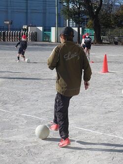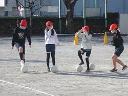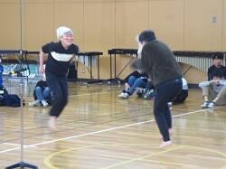 赤いコーンを回って、スタート地点に戻ったら、次の人に輪を渡します。