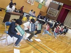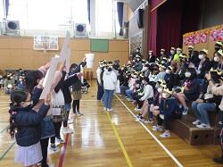 1年生退場(6年生が手をつなぎ、5年生が花輪)