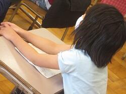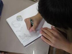 「空書き」をしてから、プリントにある文「ほそながい ほらあなを ほる」を読んで、