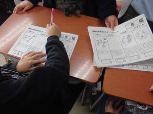3月15日(金)3校時、3年生の授業の様子です。1組は社会でした。方位について学習していました。2組は図工でした。水彩技法体験教室で描いた下絵に自分の世界を表現していました。