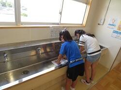 1学期からずっとですが、用務員さんが学校中の手すりやドアノブを毎日消毒しています。