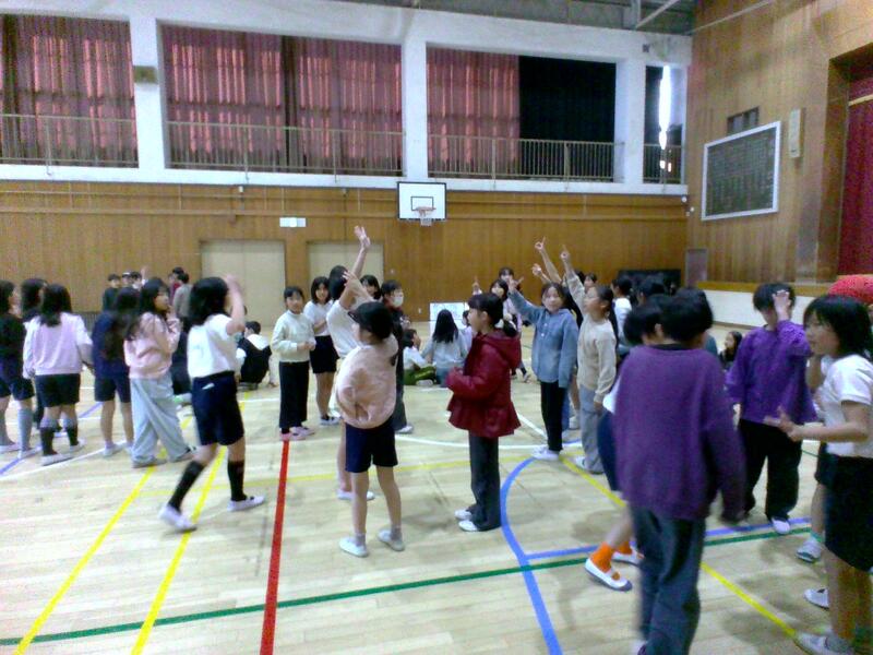 3,4人のグループになり、グーは全員がしゃがみ、チョキはグループ内の一人は立ったまま、他の二人がしゃがみ、パーは全員立つ、というやり方でじゃんけんをしました。