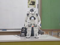 子どもたちはワークシートやカードを使って、NAOに早口言葉を言わせたり、動きをつけて発話させたりするコードを考えました。自分たちの作った指示どおりにNAOが動く様子に大いに盛り上がり、代表児童がNAOと手をつないで歩く体験もできました。
