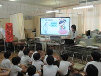 社会人野球時代には、自動車部品に関わる仕事をしながら野球をしていたことが明かされました。「皆さんの家の車には、もしかしたら僕が関わった部品があるかもしれません。」との話には、社会科の学習で自動車生産について学んだばかりの児童は、興味深く聞いていました。