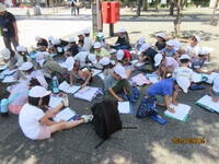 6年生の図工の初めの学習は、校庭に出て、自分が描きたい物を見つけて絵に表すという活動を行いました。