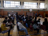 体育館では、AEDの使い方を学んだ後、実際に一人一人が練習しました。