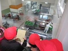 まずは、給食調理場です。毎日おいしく食べている給食がどのようにできるのか見学しました。