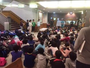 ナイトハイクでは、ガイドの田中さんに体育館でレクチャーを