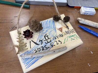 散策して拾った松ぼっくり、木の枝などを使って、八ヶ岳の思い出プレートを作ります。