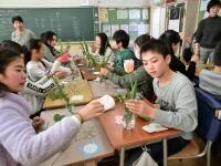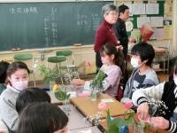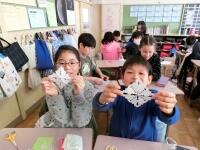 いよいよ、開校式典、校歌・校章お披露目会です。残念ながら予報通りの雪で、校庭にはすでにうっすらと積もっています。今日に向けて、お客様をおもてなそうと、5年生が花を生けてくれました。花器やコースターも手作りです。
