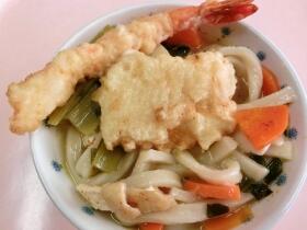 先週の給食には「天ぷらうどん」がでました。エビとイカの天ぷらです。寒い時期の温かい麺類に、子どもたちは大喜びでした。