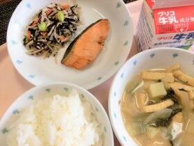 8日(金)ご飯、鮭の幽庵(ゆうあん)焼き、ごぼうとひじきのサラダ、ジャガ芋とタマネギの味噌汁、牛乳