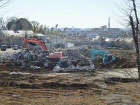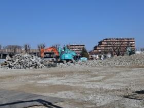 旧けやき台小学校の校舎の解体工事が進んでいます。南側の工事トラック入り口からのぞくと、高さのある建物はほぼありません。北側のショッピングモールから見ると、基礎部分の解体をしているのがわかります。あと一月ほどで、全ての解体工事が終わる予定です。