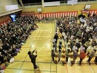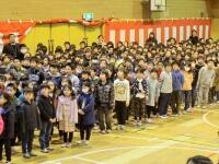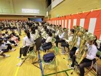 2月9日(土)に校歌・校章のお披露目をする開校記念式典が催されました。校歌の作曲者で世界的なジャズピアニストの山下洋輔さんも来校され、ご挨拶をしていただきました。校章のデザインをした九中生の杉浦璃々子さんたちに記念の楯が贈られ、代表で杉浦さんが応援のメッセージを話してくれました。校歌を歌と吹奏楽で披露し、山下さんも満足そうな表情でした。最後に、サプライズで「みんな大好き」を歌いましたが、感激して涙を流しながら聞いていたご来賓もたくさんいたそうです。