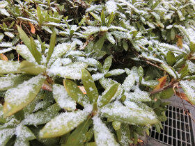 2月9日(土)の午前中は5~10cmの積雪が予想されていましたが、結局、降ったのはちょびっとだけで、校歌・校章のお披露目や開校記念式典に影響がなく、ホッとしました。夕方から少し降って、葉っぱの上や屋根はうっすらと雪化粧でした。