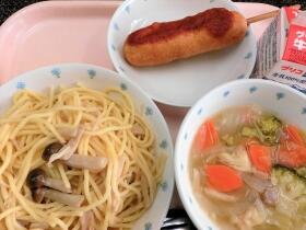 12日(火)キノコのペペロンチーノ、アメリカンドック、鶏肉と野菜のジンジャースープ、牛乳