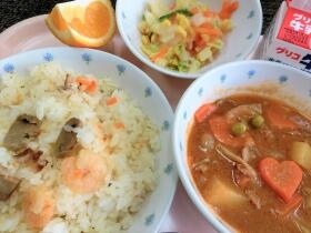 15日(金)えびピラフ、ポークシチュー、白菜のサラダ、牛乳