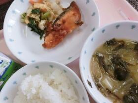 8日(金)ご飯、サケの南蛮漬け、おかか和え、ジャガイモとタマネギの味噌汁、牛乳