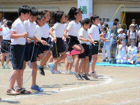 5年生の表現は、普段やっている縄跳びを取り入れた集団演舞で題して「Go!Go! Jumping!」。「みんなでそろえると楽しいね」を合い言葉に、個人技だけでなく、2人3人が協力しての縄跳びに挑戦しました。なかなかうまくいかず、休み時間に自主練をして、当日はうまく飛べた子もいたそうです。
