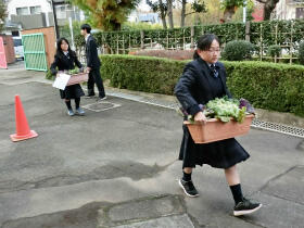 12月3日(月)に、立川九中から葉ボタンのプレゼントがありました。九中では毎年、1年生を中心に栽培した葉ボタンを、若葉町のいろいろな施設にプレゼントしています。生徒会の役員から若葉台小の代表委員に贈呈され、代表委員が「大切に育てます」というお礼の言葉を述べ、受け取りました。