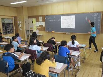 続いて授業の様子です。まずは5・6年生。5年生は今年度2回目となるプールでの学習がありました。6年生の教室では、学期末に行うお楽しみ会の計画を学級会で話し合っていました。また、英語の学習では一人ずつ前に出て発表の時間だったようです。