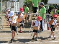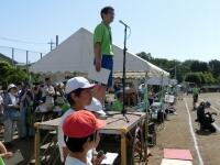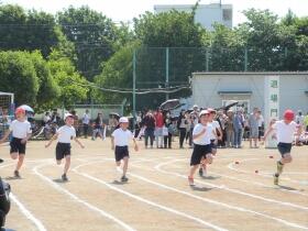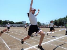 100m走は5年生以上です。4年生から20m伸びるだけで結構大変なんです。でも、スタートからコーナーを駆け抜けゴールに飛びこんでいく姿は力にあふれています。退場まで全力でした。