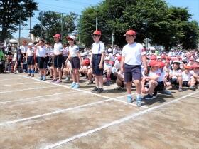 開会式では、1年生が児童代表の言葉を述べました。小学校初めての運動会への期待と意気込みが伝わってきました。一方、応援団長の誓いのことばには、最高学年として、学校を引っ張っていこうという強い思いを感じることができました。「ゴーゴーゴー」を元気に歌い、ラジオ体操で準備運動をしました。