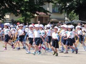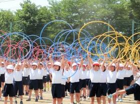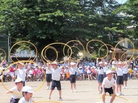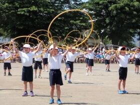 運動会まであと4日。少ない練習時間の中で、各学年の練習にも熱が入ります。2年生はフープを使っての表現です。隊形移動と同時に、フープの扱いがポイントです。