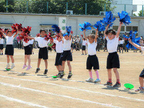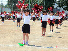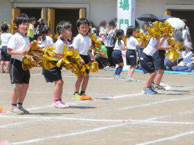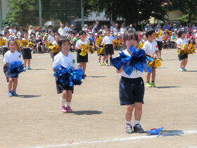 1年生の表現「世界中のこどもたちが」です。カラフルなポンポンが、強い日差しを受け輝いてとてもきれいです。「かっこうよく踊ろう」を目標に、大きく踊ること、リズムに合わせて踊ることを練習してきました。ポンポンだけでなく一人一人の笑顔がキラキラと輝いて見える素敵な踊りでした。