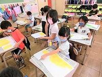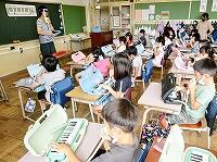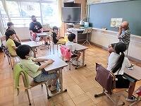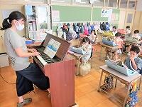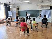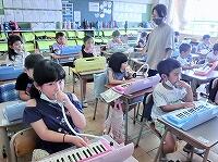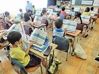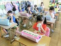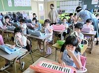 1年生の音楽の授業で鍵盤ハモニカを使い始めました。最初の時間には音楽専科の先生から、楽器の使い方や吹き方の注意を教わりました。コロナ感染予防で、吹くときには吹き口にハンカチを当てます。小学校に入って初めての楽器なので、みんなとてもうれしそうな顔です。2時間目からは担任が教えます。