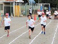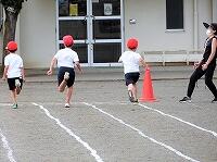 運動会の徒競走に向けてのタイム測定の4年生の様子です。4年生ぐらいになると、だんだんと力強い走りが見られます。