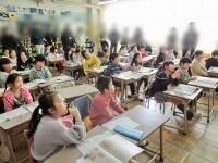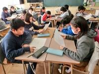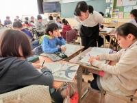 今日から1月31日まで、校内書写展を実施します。力作揃いですので、授業公開の折りなど、他学年の作品もぜひご覧ください。写真は6年生が作品を書いている様子です。本当は、広い場所で書かせたいのですが場所がないので、教室で立って書いたり、座って書いたり、一工夫が必要です。