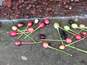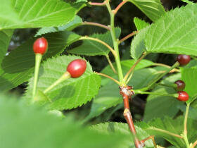 昨日5月21日は、二十四節気の一つ「小満」です。小満は、新緑が深さを増していき、花が咲き、木の実がなるなど、様々な動植物の勢いが強くなる季節と言うことです。写真は、サクランボの実です。上の2枚は町なかで見かけたサクランボで、1cmにも満たないけれど、かじってみたら売っているのとほぼ同じ味でした。下の2枚は学校の桜で、苦くて渋くて!!!!という味でした。