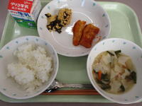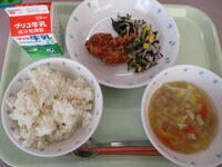 今日は、ごはん、鮭の柚庵揚げ、もやしときゅうりの和え物、なめこと豆腐のみそ汁でした!
