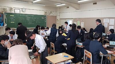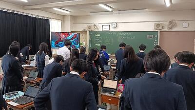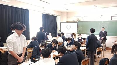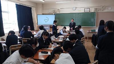 2年生の英語では田中先生の研究授業が行われ、市内や市外の先生方も参観に来られました。ほぼ100%に近いオールイングリッシュの授業でした。英語で自分の意見を伝える意欲の高い生徒の皆さんにあらためて素晴らしいと感じました。先生方も常に学び続けています。