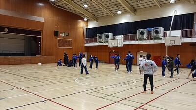 I組では「芸術家と子どもたち」というNPO 法人の方が4名来校されました。アーティストの動きを真似てみたり子どもたち同士が教え伝えあったり、とても楽しい授業でした。