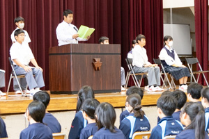 オンライン形式で、立川市・大町市中学生サミットの報告と各種表彰の内容で朝礼を行いました。