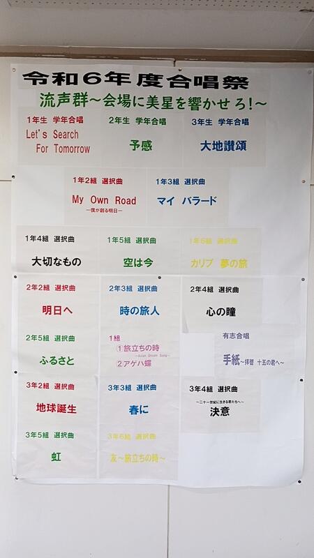 今年の合唱祭は、熱量の高い合唱祭でした。生徒や先生方の意気込みを感じました。嬉しく感じます。講評にもありましたが、歌を通して何を届けたいのか、歌詞の背景や歌詞の意味を深く学習するとまた何か違うものが見えてくるかもしれません。次の合唱祭で挑戦してみてください。一方で鑑賞態度は、もう少ししっかりできることを期待します。聴くことも学びです。来年度もより高めあっている2中生の姿を伝えていきましょう。