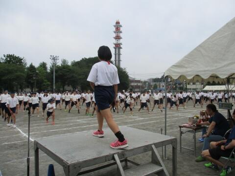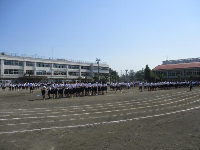 次は、運動会実行委員のリードでラジオ体操です。550名近い生徒が一斉に動きます。集中をして行動しないとぶつかったりします。生徒は運動会実行委員の指示に集中して動作を機敏に行っていました。