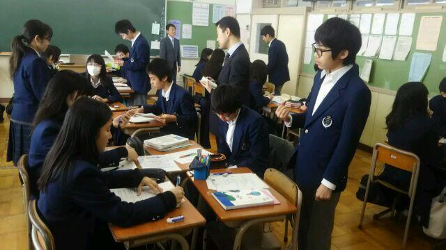 今日は土曜日ですが、授業がありました。3年は、3・4時間目に修学旅行事後学習発表会を行いました。保護者の方々にも参観いただきました。班行動したグループをさらに分け3人程度の人数でパワーポイントによる発表資料を作り、クラス内で発表を行い、選ばれたグループが本日皆の前で発表をしました。内容は、見学してきた寺社仏閣を中心に、どのグループの発表もパワーポイントのアニメーション機能を見事に使いこなしていました。そして、発表では、クイズ形式にしたり、笑いを誘ったりするなど工夫が見られ楽しく充実した発表会でした。さて、どのグループの発表が選ばれるのか、楽しみです。