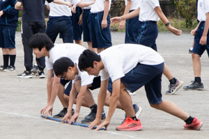 複数重ねた段ボールの箱を落とさないように運び、次のチームへとリレーをしてタイムを競う競技です。受け渡しの時に持ってよいのは一番下の箱のみ。チーム編成や運び方をどうするかはそれぞれの学級の作戦です。