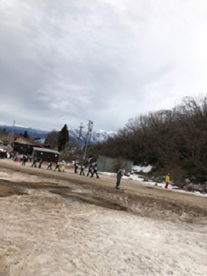 ■うっすら土が見えるゲレンデです。宿舎前で地元の方が、「雪解けの水が少な