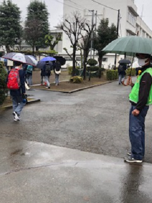 大変ですが、生徒は地域の方と元気にあいさつをかわしていました。