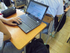 11月20日(木)の授業のようすです。1年生の保健体育ではマット運動を行っていました。前転・後転・開脚前転・開脚後転の中から自ら選んで練習をしていました。2年生の数学では、いろいろな角の大きさを求める授業で生徒が作った問題を、電子黒板を使って発表し合っていました。3年生の美術では、いろいろな作家のリンゴの描写の技法をクロムブックで検索し、それを真似てリンゴを描いていました。