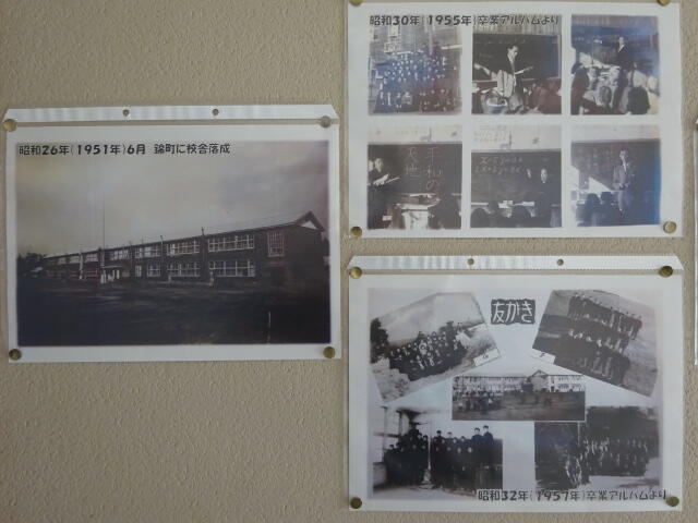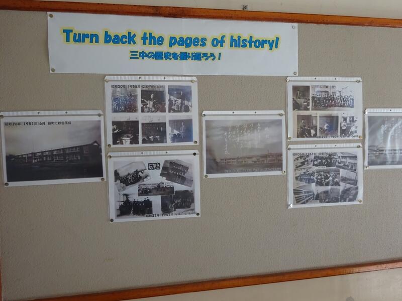 現在、北校舎1階の渡り廊下近くに、昔の三中の様子を写した写真が掲示されています。今の第七小学校の場所に建てられた初めての校舎、現在の場所に建てられた校舎の様子や、昭和20年代から40年代の授業風景など、貴重な写真ばかりです。