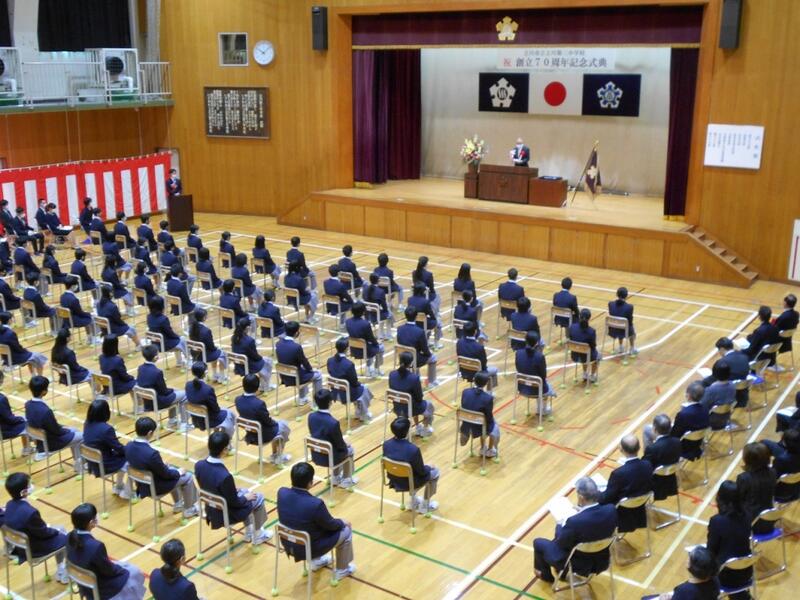 式典の最後には、事前に撮影した、3年生による校歌斉唱と「70」の人文字の動画をスクリーンに映し、見ていただきました。
